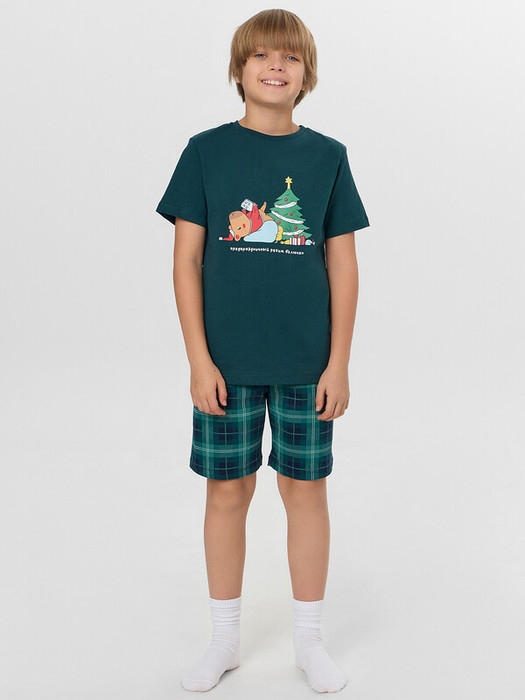 Пижама для мальчиков. Выполнена из хлопкового трикотажа кулирного переплетения. Комплект включает футболку и шорты. Футболка свободная, с круглой горловиной и короткими рукавами. Шорты длиной до колен, с эластичной тесьмой в поясе. Отличный комплект для сна и отдыха!