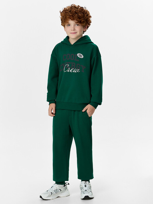 Худи свободного силуэта для мальчиков с капюшоном. Горловина округлой формы. Капюшон со средним швом, на подкладке из основного полотна. Плечо спущено, рукав втачной длинный. По низу рукава отрезная манжета из рибаны. Пояс отрезной из рибаны.Брюки для мальчиков. Без бокового шва. Карманы в вытачке. Пояс отрезной с внутренней эластичной тесьмой. Пояс прострочен двумя отделочными строчками. Внутри в пояс втянут шнур. Низ брюк обработан манжетами из рибаны.