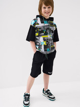Худи свободного силуэта для мальчиков с капюшоном. Горловина округлой формы. Капюшон со средним швом, на подкладке из основного полотна. Плечо спущено, рукав втачной длинный. По низу рукава отрезная манжета из рибаны. Пояс отрезной из рибаны.Брюки для мальчиков. Без бокового шва. Карманы в вытачке. Пояс отрезной с внутренней эластичной тесьмой. Пояс прострочен двумя отделочными строчками. Внутри в пояс втянут шнур. Низ брюк обработан манжетами из рибаны.