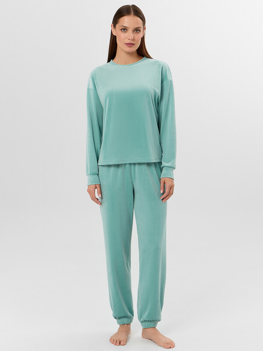 Джемпер с круглой горловиной и спущенной линией плеча обеспечивает комфорт и свободу движений. Длинные рукава с отрезными манжетами и аккуратная обработка низа добавляют модели долговечности. Брюки с эластичным поясом и манжетами на штанинах обеспечивают идеальную посадку и не сковывают движения. Мягкий велюр сохраняет тепло, приятен к телу и хорошо держит форму. Этот комплект станет идеальным выбором для отдыха дома, неспешных прогулок или уютных вечеров в кругу близких.