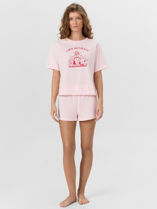 Комплект женский состоит из футболки и шорт. Футболка свободного силуэта. Горловина круглой формы, обтачка из основного полотна. Рукава втачные свободные, линия плеча слегка спущена. Низ рукавов и футболки в подгибку.