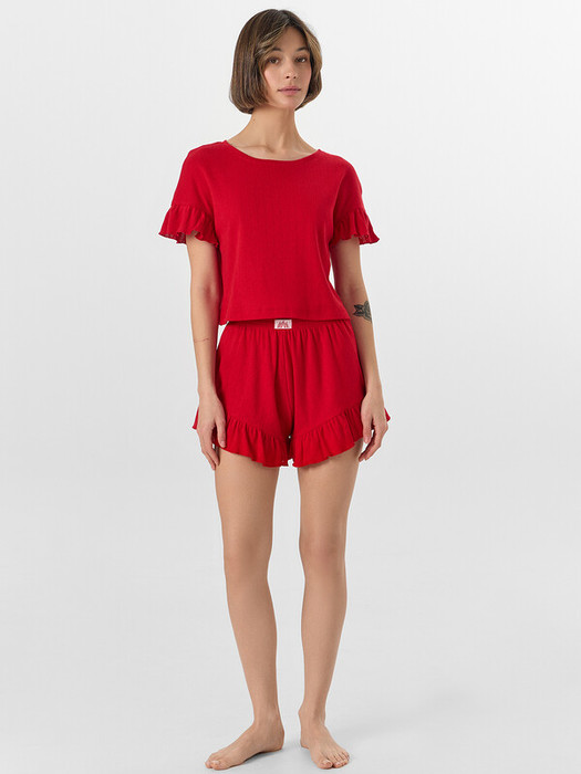 Шорты свободного силуэта, укороченные, с посадкой на талии. Пояс цельнокроеный, с втачной эластичной тесьмой 30RV. По шву сидения силиконовая лента 4мм, Sil-4. По низу шорт рюши, обработанные на микрооверлоке.