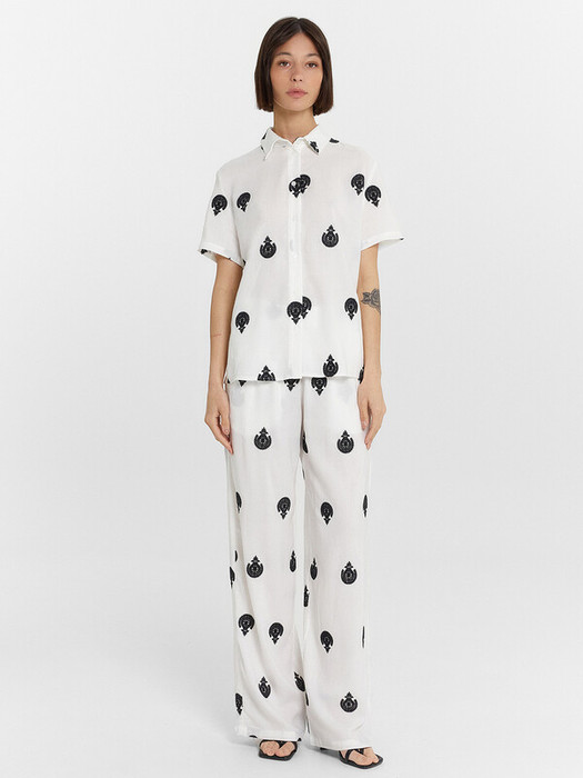 Комплект состоит из рубашки и брюк (182508). Рубашка полуприлегающего силуэта, укороченная. Горловина круглая, воротник рубашечный. По переду застежка на петли и пуговицы (D 10мм). Рукава втачные короткие. Нижний срез фигурный. Нижний срез рубашки и рукавов обрвботан швом вподгибку. Брюки прямые, свободные. Посадка средняя. Пояс цельнокроеный, с эластичной тесьмой внутри (внутр. 50мм 50RV). В боковых швах обработаны карманы. Брюки слегка укорочены, подгибка низа широкая.