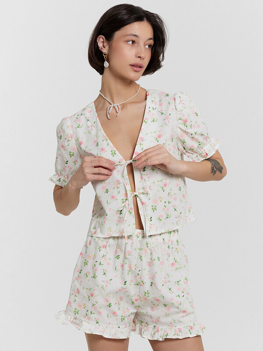 Шорты свободного силуэта, укороченные, с посадкой на талии. Пояс цельнокроеный, с втачной эластичной тесьмой 30RV. В низу шорт рюши, обработанные в подгибку.