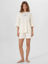 Рубашка с отложным воротником и короткими рукавами застегивается на аккуратные пуговицы. Свободные шорты с эластичным поясом бережно облегают талию, не стесняя движений во время отдыха или домашних дел.