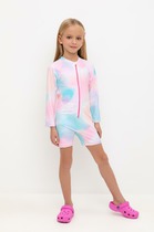 Трикотажное эластичное полотно. Трикотажное полотно, подкладка для купальников. Передняя и задняя детали топа, передняя и задняя детали трусов цельнокроенные. Подкладка передней детали топа и подкладка ластовицы, передней детали трусов из трикотажного полотна. Верхние и нижние срезы трусов и топа обработаны бейкой из основного полотна. По спинке топа застежка. Бретели из основного полотна с надставками, регулируются по длине сзади.