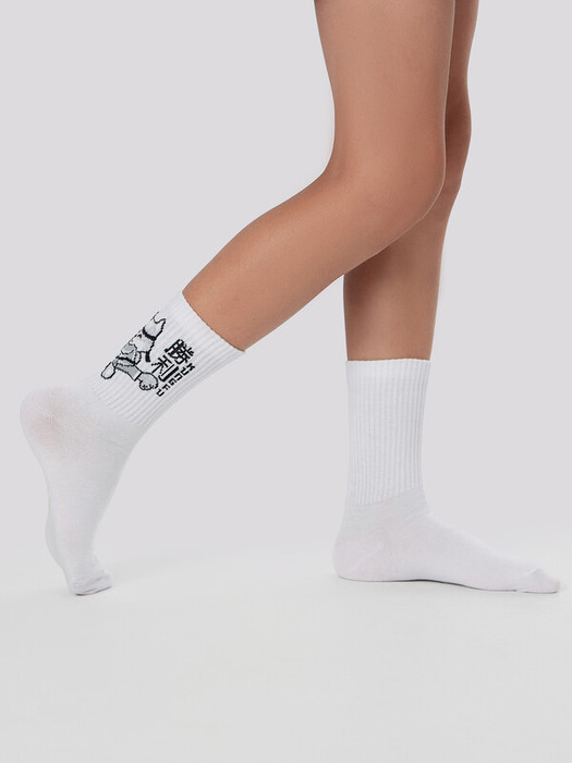 рис.2706 Детский носок гладкий с высокой резинкой и рисунком в виде кота-каратиста с иероглифами.