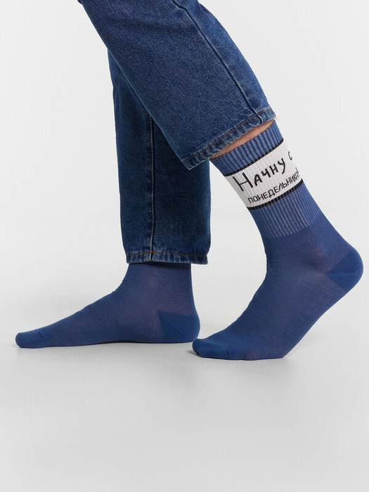 Высокие классические носки женские с плотным бортом и рисунком в виде надписи "Начну с понедельника". Носки женские выполнены из высококачественного гребенного хлопка - тонкого, прочного и эластичного. Натуральные волокна отлично пропускают воздух и впитывают влагу, обеспечивают ощущение комфорта в течение дня. Благодаря небольшому количеству эластана в составе, носочки хорошо облегают и сохраняют форму, практичны и долговечны. Пятка и мысок дополнительно усилены для защиты от протирания при активном движении. Резинка мягко, но надежно удерживает носки, не передавливая ногу и не оставляя на коже следов. Отличный вариант для зимних дней и новогодних праздников. Нежные, достаточно теплые и мягкие, создадут атмосферу тепла и уюта. Порадуйте себя и своих близких прекрасными носочками от Mark Formelle!