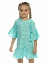 Платье для девочек силуэта трапеция. Рукава короткие цельнокроеные. По низу рукавов притачана рюша из основного полотна. Края рюши обработаны узким швом вподгибку. Низ рюши рукавов обработан швом в подгибку. Горловина круглой формы обработана обтачкой из рибаны. Шов притачивания обтачки закрыт бейкой из основного полотна. Низ платья обработан швом вподгибку на 2-ух игольной плоскошовной машине.