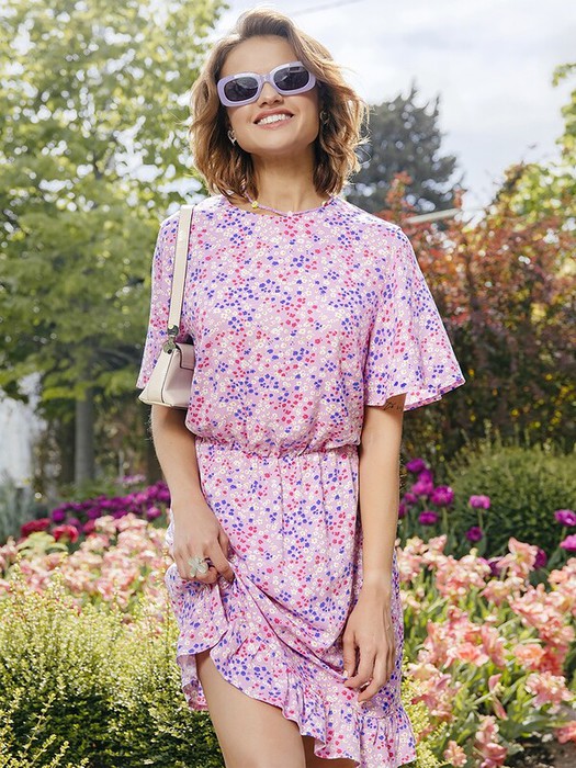Женское полуприлегающее платье длиной выше колена из нежной и легкой вискозы. Модель отрезная по талии, внутри пояса проходит эластичная тесьма, образующая сборочки. Горловина круглая, рукава короткие и расширенные к низу. Нижний край платья украшен рюшей. На спинке застегивается на потайную молнию. Стильное платье для ваших летних образов!