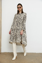 Прилегающее женское платье длиной ниже колена. Выполнено из трикотажной рибаны – в рубчик. Вырез круглый, с чуть удлиненным воротником. Рукава узкие, слегка удлиненные. От линии бедер платье расширяется и завершается асимметричным нижним краем. Красиво!