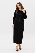 Платье полуприлегающего силуэта из ткани рошель. Горловина V-образной формы. Платье отрезное по талии, с эластичной тесьмой внутри. По эластичной тесьме проложены отделочные строчки. По детали переда средний шов. Детали спинки со средним швом. Рукав втачной, длинный. По окату слегка присборен. Длина рукава  3\4, по низу рукава настрочена эластичная тесьма которая делает сборку. Низ платья расширяется к низу. Длина платья ниже колена.