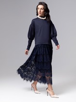 Платье женское прямого силуэта из трикотажного полотна селаник. Горловина круглой формы, с притачным воротником с отрезной стойкой из поплина и застежкой на пуговицу. Плечо слегка спущено, пройма углублена. Рукав втачной, длинный, по низу с отрезной манжетой из селаника. Платье длиной чуть выше колена.