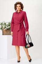 Платье прямое свободное, длиной миди. Горловина V-образной формы со стояче-отложным воротником. Плечо слегка спущено, рукав втачной, длинный. По низу рукавов отрезные манжеты с разрезами. Центральная застежка на петли и пуговицы. В боковых швах обработаны карманы. По бокам внизу обработаны разрезы. Нижний срез платья обработан швом вподгибку с закрытым срезом.