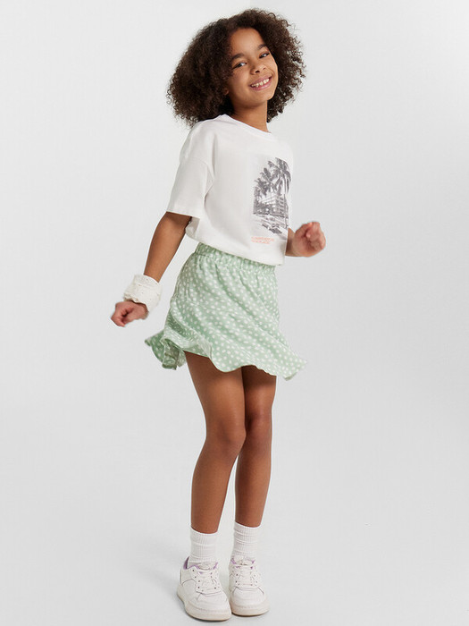 Шорты для девочек свободного силуэта из ткани. Посадка высокая. На детали переда карманы с отрезным бочком. Пояс отрезной с эластичной тесьмой внутри, на поясе пробиты петли и вставлен шнур из основного полотна. Шов втачивания пояса распошит. Шорты немного расширяются к низу. Длина выше колена. Низ шорт обработан швом в подгибку с закрытым срезом.