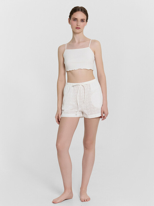 Шорты свободного силуэта, высокая посадка. Верх застрочен в подгибку с протянутым шнуром из основного полотна и резиной 20RV. В боковых швах карманы. Низ шорт обработан вподгибку.