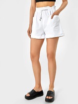 Шорты женские свободного силуэта из ткани. На детали переда карманы с отрезным бочком.