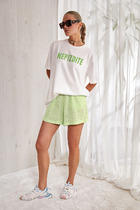 Шорты свободные, короткие. Посадка высокая. Пояс цельнокроеный с эластичной тесьмой внутри (внутр. 40мм, 40RV). В боковых швах обработаны карманы, подкладка из основного полотна. На задней правой половинке накладной карман. Нижние срезы обработаны швом вподгибку.