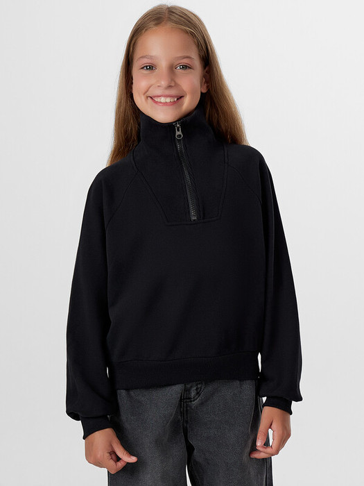 Свитшот свободного силуэта. Рукава длинные, реглан. Линия плеча спущена. Перед и спинка цельнокроенные. Горловина круглой формы с втачным воротником из рибаны. По переду изделия застежка-молния. По низу рукавов и джемпера притачены манжеты и пояс из рибаны.