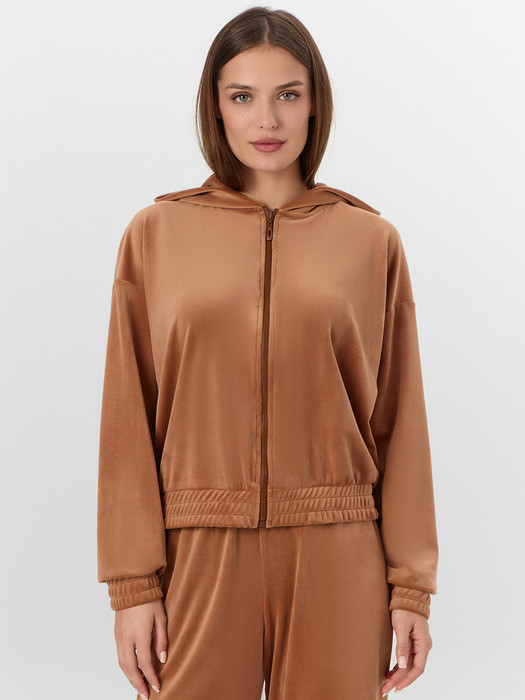 Манжеты на рукавах и пояс по низу, дополненные декоративными строчками, обеспечивают аккуратную посадку. Внутренние швы горловины обработаны мягкой хлопковой тесьмой для приятных тактильных ощущений. Велюровый материал с добавлением эластана мягко тянется и дарит нежность при каждом движении. Эта толстовка станет любимым предметом гардероба для спокойных вечеров и утреннего отдыха.