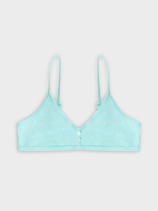 Мягкая  треугольная чашка. Верхний срез чашки обработана декоративной эластичной тесьмой с зубом 10 cм KTE2-10 . Спереди планка, имитация застежки, с двумя пуговицами на два прокола d=10 мм. Проймы обработаны бейкой, образующую бретель с регуляторами. Внутри брители, жилка  WT4-6. По низу изделия бейка из основного полотна внутри с режиной 10RV. Кольца/регуляторы 8мм.