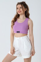 Укороченный женский топ облегающего силуэта. Выполнен из трикотажной рибаны. Горловина круглой формы. Спереди есть фигурный подрез. Стильно и комфортно!
