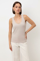 Топ женский изготовлен из трикотажного полотна интерлок. Топ облегающего силуэта на широких бретелях. Вырез горловины округлый.