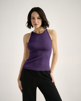 Топ облегающего силуэта, на узких бретелях. Горловина V-образной формы. Топ на подкладке из сетки, с чашками-вкладышами. Горловина и проймы окантованы бейкой из основного полотна. Бейки по проймам переходят в бретель, с регулировкой по длине (кольца и регуляторы). Топ с фигурным подрезом под грудью. В бретелях, окантовке горловин и пройм, по фигурному подрезу, эластичная тесьма. Нижний срез обработан швом вподгибку с эластичной тесьмой внутри