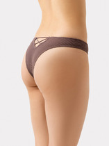 Трусы женские, средняя линия талии, силуэт - бразилиано. Передняя и задняя детали выполнены из рибаны. Верхний срез трусов обработан бейкой поперечной из рибаны, внутри жилка 6мм. Нижние срезы обработаны бейками поперечными из рибаны. Подкладка ластовицы из хлопка, верхний срез ластовицы притачан к детали из рибаны (с изнаночной стороны имитация мужского гульфика, с лицевой стороны декоративные строчки).