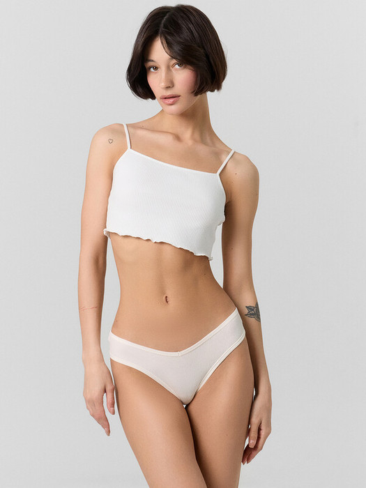 Трусы женские, средняя линия  талии, силуэт - бразилиано. Передняя и задняя детали выполнены из рибаны. Верхний срез трусов обработан бейкой поперечной из рибаны, внутри жилка 6мм. Нижние срезы обработаны бейками поперечными из рибаны. Подкладка ластовицы из хлопка, отлетная по верхнему срезу. Посередине бейки по верхнему срезу передней и задней детали застрочена «птичка».