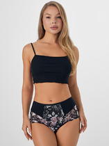 Изящные трусики-бразилиана — воплощение комфорта и утончённого стиля. Выполненные из эластичного кружева и мягкого кулирного полотна, они обеспечивают идеальную посадку благодаря средней высоте талии и V-образному силуэту. Передняя часть выполнена из кружева, добавляющего женственность, а задняя деталь из гладкого кулирного полотна со средним швом для дополнительного комфорта. Ластовица из натурального материала и аккуратная обработка нижних срезов швом вподгибку завершают этот элегантный образ.