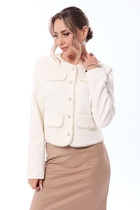 Жакет женский прилегающего силуэта. Горловина округлой формы обработана обтачкой 25мм в готовом виде из основного полотна. Рукав втачной, длинный. Жакет с центральной застежкой с петлями и пуговицами 10мм. Низ изделия и рукавов обработаны швом в подгибку.