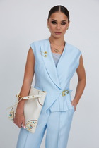 Жилет прилегающего силуэта. Горловина обработана обтачкой из основного полотна, по спинке и проймам бейка из кулирки. Спереди центральная застежка на петли и пуговицы 20мм. Спинка со швом, низ обработан в подгибку