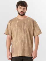 Футболка прямая, свободная. Горловина округлой формы обработана обтачкой из рибаны. Шов втачивания обтачки по спинке закрыт бейкой из основного полотна. Рукава втачные, корткие. Линия плеча спущена. Нижние срезы футболки и рукавов обработаны швом вподгибку.