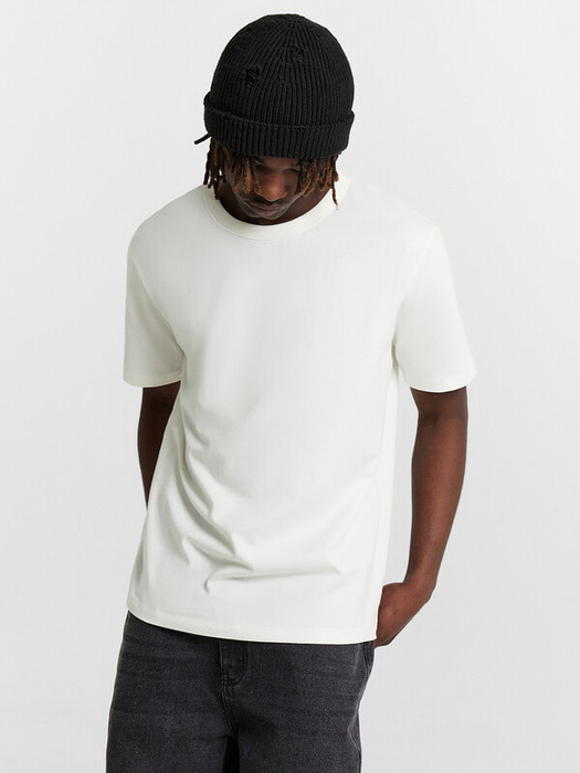 Футболка прямая свободная. Горловина округлой формы окантована бейкой в 4 сложения из рибаны. Горловина отстрочена на двухигольной плоскошовной машине.Плечо слегка спущено. Рукава втачные короткие. Низ футболки и рукавов обработан швом вподгибку.