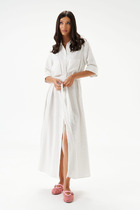 Платье прямое, свободное. Длина мини. Горловина с цельнокроеной стойкой. Рукава втачные длинные. Плечо спущено. Спинка со средним швом. Нижние срезы обработан швом вподгибку.