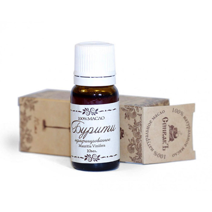 Масло бурити богато незаменимыми жирными кислотами, витаминами, а также бета-каротином — его содержание в масле бурити даже выше, чем в масле семян моркови! Аборигены использовали масло бурити для лечения ожогов благодаря его успокаивающим и регенерирующим свойствам. Оно ускоряет выработку коллагена, поддерживает упругость, способствует увлажнению кожи.