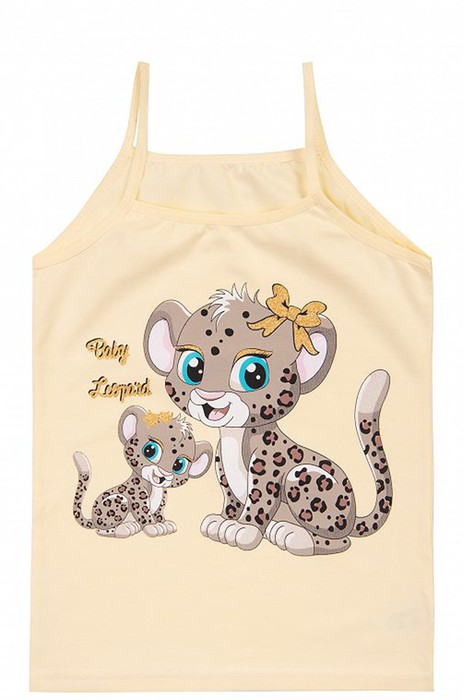 Маечка для девочки украшена принтом леопарды с золотистыми блестками. Классическая бельевая майка на тонких бретельках, выполнена из мягкого хлопка высокого качества. В состав ткани добавлено небольшое количество эластана, что придает детской майке на тонких бретелях особую эластичность. Благодаря своей легкости, мягкости и воздухопроницаемости трикотажная майка идеально подходит для детей.