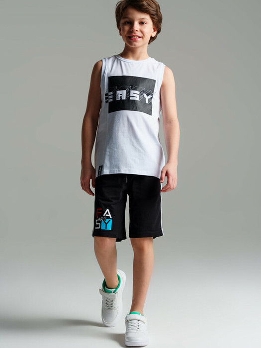 Майка трикотажная для мальчика. Regular fit – классический прямой силуэт. Высокое содержание хлопка 95%. Благодаря наличию эластана в составе ткани изделие держит форму и меньше мнется.