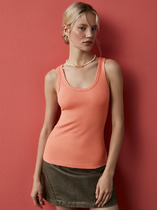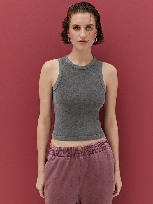 Женская майка в рубчик с вареным эффектом, круглым вырезом и широкими бретелями.