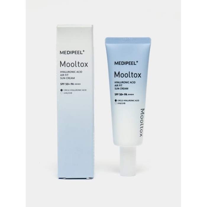 Лёгкий солнцезащитный крем с гиалуроновой кислотой Medi-Peel Mooltox Hyaluronic Acid Air Fit Sun Cream SPF 50+ PA++++, содержащий комбинацию органических, минеральных и современных химических УФ-фильтров, обеспечивает надежную защиту от UVA и UVB лучей, предотвращает фото-аллергические реакции и гиперпигментацию, защищает кожу от преждевременного старения, глубоко увлажняет, выравнивает тон и сужает поры. Крем легко распределяется по коже, обеспечивая лёгкий увлажняющий финиш без ощущения жирности и липкости.