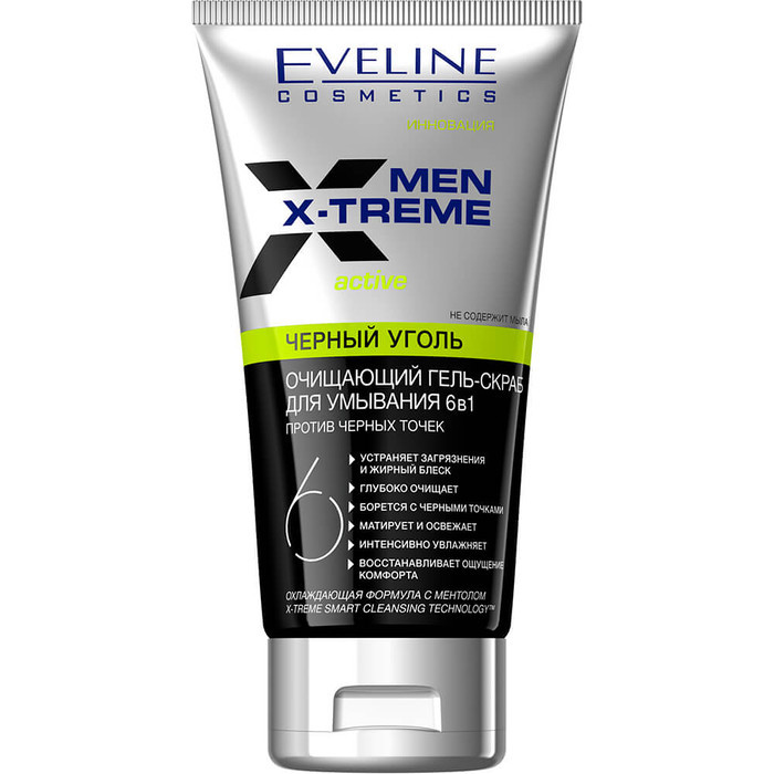 Для всех типов кожи. Очищающий гель-скраб для умывания 6 в 1 разработан на основании формулы, соединяющей в себе силу очищающего черного угля и салициловой кислоты, а также успокаивающий эффект D-пантенола с освежающим ментолом. Ежедневное применение геля предотвращает появление проблем мужской кожи. Благодаря применению X-tream smart cleansing technology™ гель очищает, интенсивно борется даже с несовершенствами и предупреждает их появление. Не сушит кожу и восстанавливает ощущение комфорта. Черный уголь действует на кожу, как магнит, притягивая все виды загрязнений (себум, пот, смог, сигаретный дым, пыль и т.п.). D-пантенол увлажняет, снимает раздражения, укрепляет защитный липидный барьер. Ментол придает коже энергию, освежает и улучшает микроциркуляцию крови.