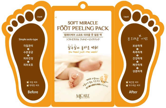 Пилинг для удаления омертвевших клеток со стоп всего за неделю использования полностью обновляет кожу стоп. Является прекрасной альтернативой педикюру. Содержит множество растительных экстрактов с высоким содержанием АНА-кислот, которые мягко отшелушивают кожу на ногах. Масло камелии эффективно питает и увлажняет кожу, делая ее мягкой и нежной. Пилинг начинает заметно действовать примерно на 4 день, когда старая кожа на ногах начинает отслаиваться и на 7 день полностью обновляется и становится нежной и гладкой. В комплект входят специальные носочки, пилинг и маска-уход.