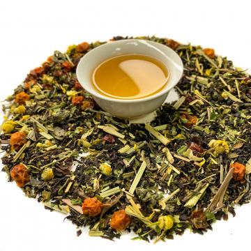 Купаж черного и зеленого чая, чабрец, мята, мелисса, липа, ромашка, лимонная трава, шиповник, рябина, календула, лист смородины. Без ароматизаторов.