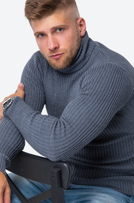Стильная водолазка с высоким воротником для мужчин выполнена из вязаного трикотажа: в ней будет уютно и тепло в прохладную погоду. Шерстяной джемпер в рубчик из мягкой пряжи с акрилом не колется, он невероятно мягкий и приятный к телу. Благодаря фактурной вязке теплая водолазка оттенка индиго хорошо тянется.