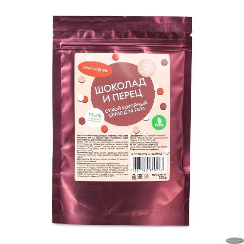 Состав: кофе молотый, соль, какао-порошок, корица молотая, миндальное масло, парфюмерная композиция, эфирное масло мандарина, СК-СО2 экстракт* красного перца, натуральный антиоксидант** (токоферол (смесь), глицерил линолеат, β-ситостерол, сквален).