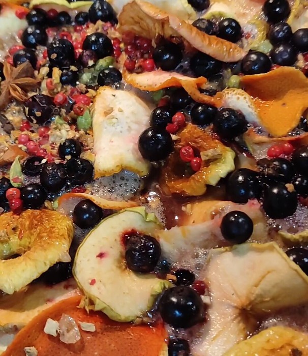 Состав: сушёный апельсин, сушеное яблоко, карамелизированный бельгийский сахар, палочки кассии, сублимированная черная смородина, изюм, сушёный имбирь, бадьян, гвоздика, и....конечно сам рецепт.