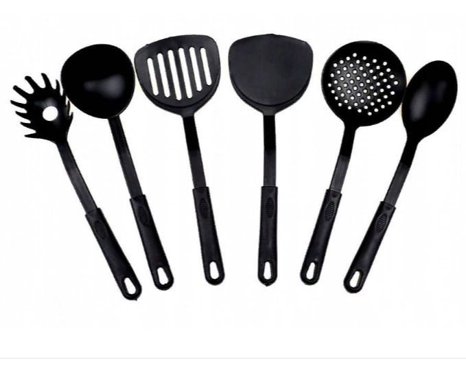 Набор кухонных принадлежностей из термостойкого пластика необходим на каждой кухне. Любая домохозяйка мечтает иметь такой набор на своей кухне. Состоит из 6 предметов: Половник, Шумовка, Лопатка, Ложка, Ложка для спагетти, Лопатка с прорезями.