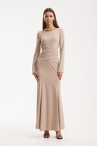 Платье свободной формы- многослойное, с воланами по косой. Горловина круглой формы, лиф переда с нагрудной вытачкой, рукав втачной одношовный.Длина рукава: 30 см.Длина изделия: 115 см.