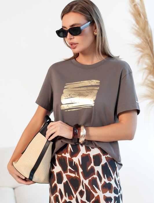 Состав: 92%Хлопок 8%ПУ Плотность: 170 Г/м2Стильная базовая футболка кофейного цвета с золотистым принтом фольгой выполнена из плотного хлопка с эластаном для комфортной посадки на любую фигуру. Прямая футболка классического кроя с круглым вырезом, прекрасно подходит для разных типов фигуры, в том числе и на большие размеры. Мягкость хлопка вместе с небольшой долей эластана гарантирует идеальную посадку и свободу движений. Легкая натуральная дышащая ткань премиального качества делает футболку с коротким рукавом идеальным вариантом для повседневной носки дома, на работу или офис. Однотонная футболка дополнена авторским аккуратным принтом с минималистичной надписью, который придает праздничный и элегантный вид без лишней вычурности. Блестящий принт аккуратно украшает, добавляя изысканный акцент и создавая легкий мерцающий эффект. Перевод надписи Trust the magic of new beginnings - Доверьтесь магии новых начинаний.